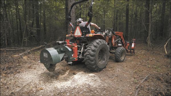 The stump grinder has a 24" diameter grinding wheel containing 34 replaceable tungsten carbide teeth. Lower the 3pt to remove an inch or so of material