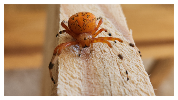 We also had an interesting orange visitor. An orange marbled orbweaver joined us at the sawmill. They are harmless to humans. I've never seen such a beautiful spider before. TK relocated it to the new red oak log bunk.